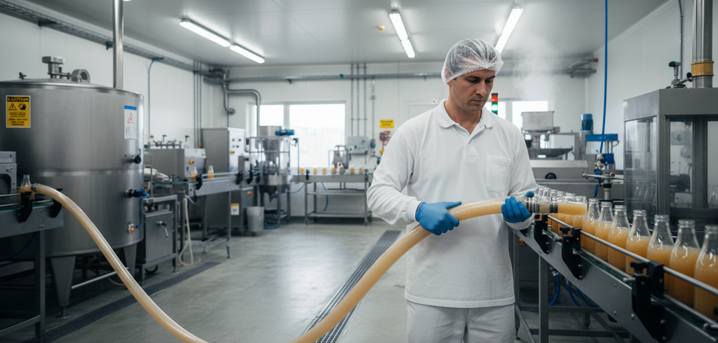 The hose boasts a very smooth surface, average flexibility, and good crush resistance, making it suitable for demanding environments. It operates efficiently within a temperature range of -5°C to +65°C, adhering to the standards set by Reg. CE 1935/2004 and Reg. UE 10/2011 for contact with foodstuffs.