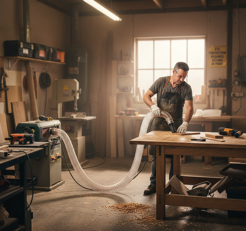 This premium flexible polyurethane hose is engineered for the effective suction and transport of dust, chips, and abrasive materials. Its construction features a copper-plated steel spiral, which enhances durability and flexibility. This hose is designed to withstand harsh conditions, making it suitable for various industrial applications.