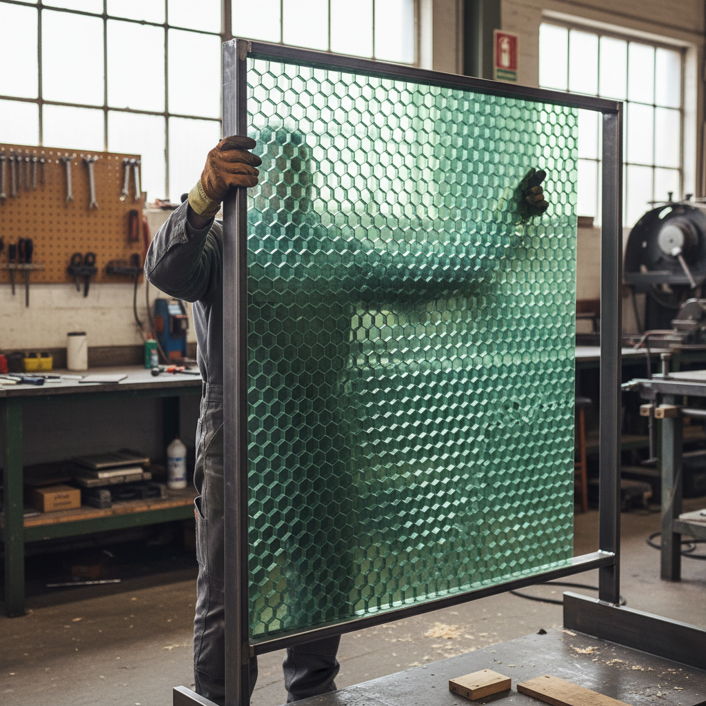 This Premium honeycomb composite sheet consists of a hexagonal aluminum core (large or small) glued between two top layers of either acrylic or PETG, depending on the application. This ultra-lightweight material reflects and refracts light within the cells, creating a soft glow from within that moves as your point of view changes. Available in a range of colors with both transparent and satin finishes.