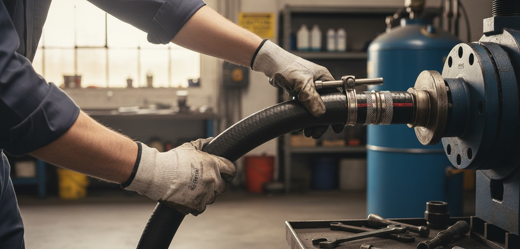 This Premium High-Performance two-layer hose is constructed from thermoplastic PVC, PU, and nitrile rubber compound, featuring an embedded galvanized steel spiral and polyester yarn reinforcement. It is designed for the suction and delivery of oils, blue diesel, diesel, and bio-diesel. The hose is characterized by a very smooth surface, exceptional flexibility, and good crush resistance.