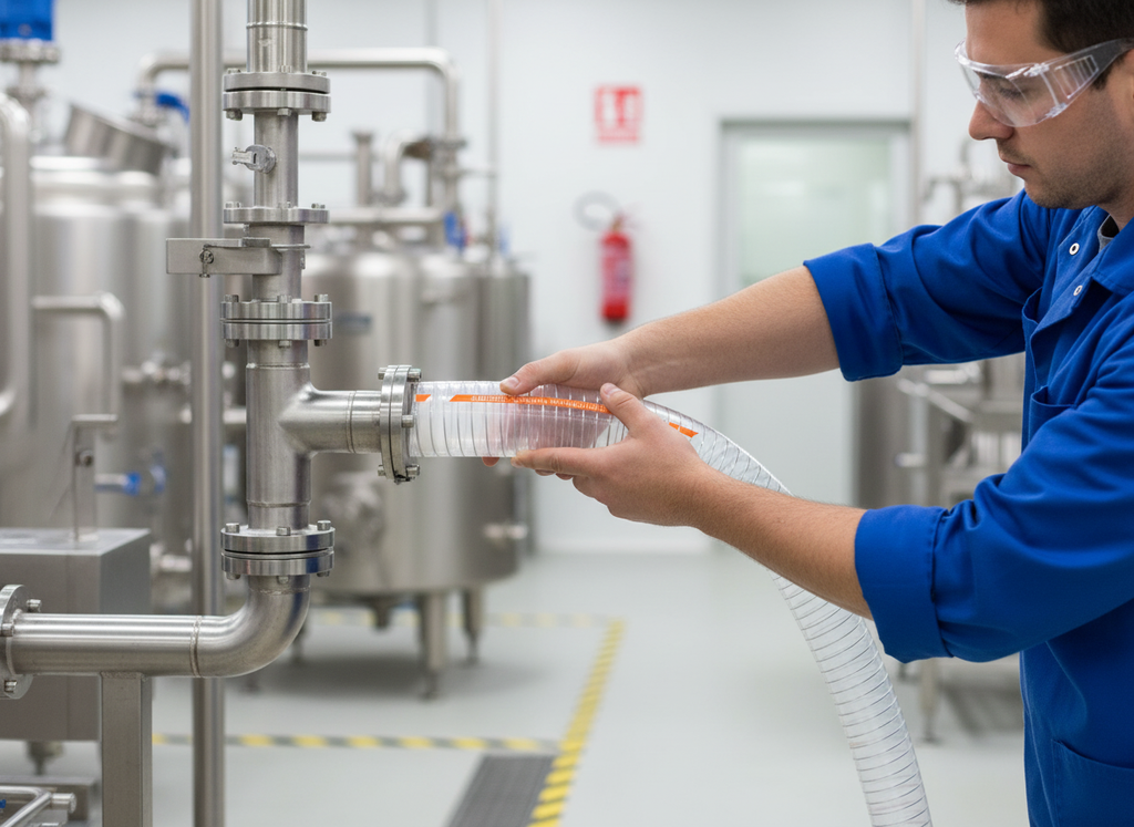 This Professional Soft PVC Hose is designed for the suction and delivery of food liquids. It features an embedded reduced pitch galvanized steel spiral, ensuring optimal strength and flexibility. The hose has a very smooth surface, excellent crush resistance, and is capable of handling a temperature range from -5°C to +65°C. It complies with the regulations CE 1935/2004 and UE 10/2011 for contact with food substances, confirmed through migration tests performed at 40°C for 24 hours.